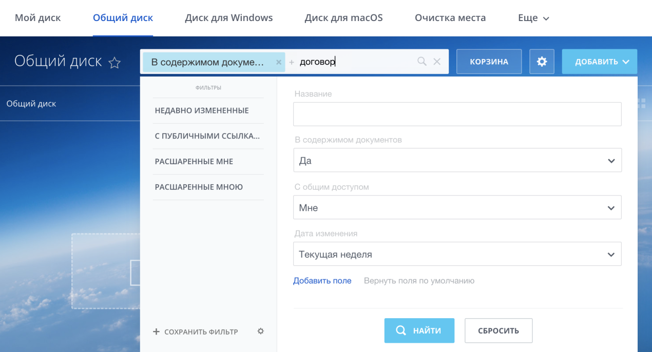 + только на тарифе Энтерпрайз доступен поиск по содержимому* документов Диска.