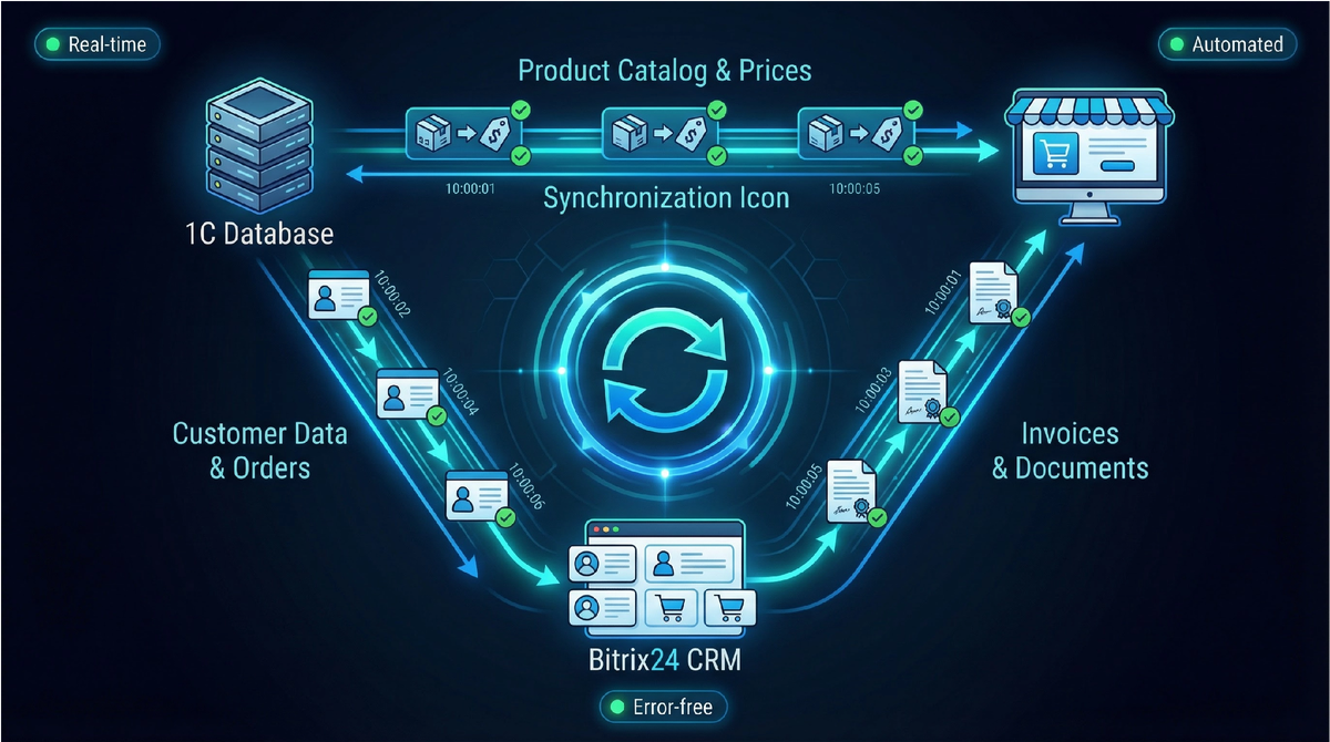 Знакомая картина: отдел продаж ведет клиентов в Битрикс24, бухгалтерия выставляет счета в 1С, а на сайте прайс-лист обновляется раз в неделю вручную специалистом, которому вечно некогда. Каждая система — это отдельная, изолированная вселенная со своими данными. Между этими вселенными — черная дыра, в которой исчезают время, деньги и лояльность клиентов. Это не просто неудобно. Это — прямой путь к убыткам. Вы платите зарплату сотрудникам, которые часами занимаются бессмысленной работой — копированием и вставкой данных из одного окна в другое. Человеческий фактор неизбежно приводит к ошибкам: неверно указанная цена на сайте — и вот уже клиент уходит к конкуренту, разочарованный несбывшимися ожиданиями. Менеджер, не видя реальных остатков на складе, обещает товар, которого нет в наличии, и срывает сделку. Каждый такой сбой — это не просто операционная ошибка, это удар по вашей репутации и кошельку.